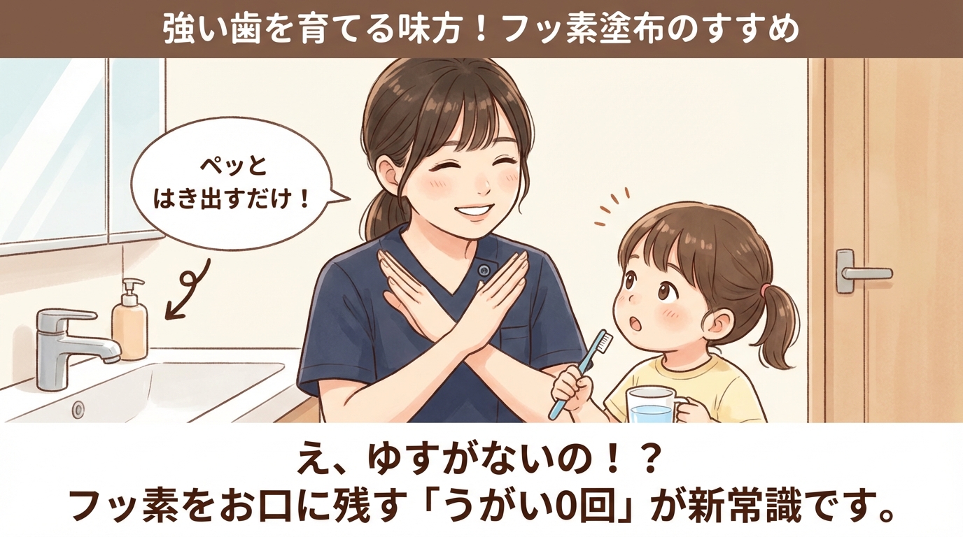 「えっ、気持ち悪くない?」と思われるかもしれませんが、ゆすいでしまうと、せっかく歯についたフッ素が水と一緒に流れてしまい、効果が激減してしまうのです。