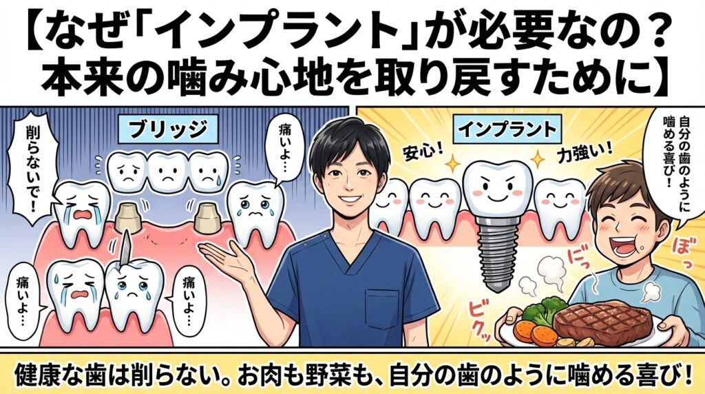 失った歯を補う方法はいくつかありますが、私がインプラントを強くおすすめする最大の理由は、「他の健康な歯を守れるから」です。