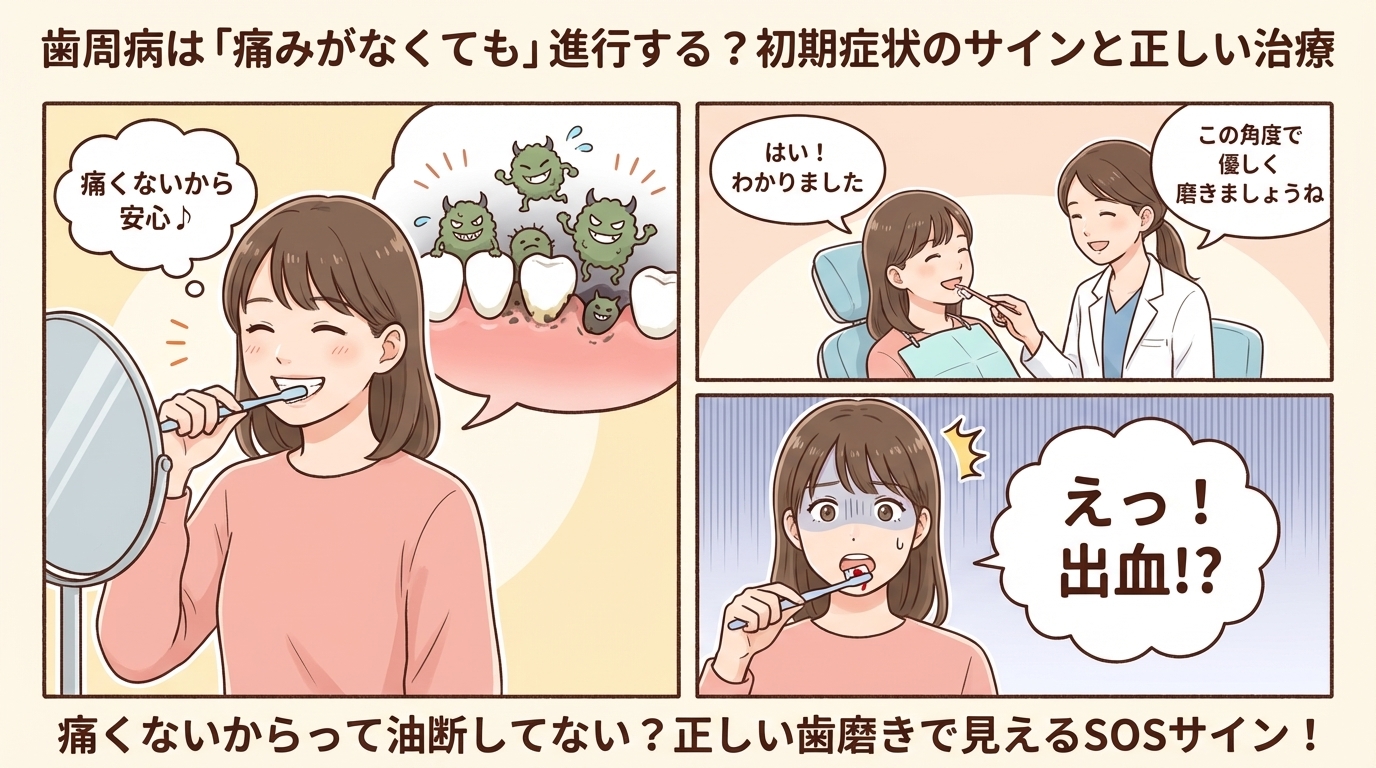 毎日しっかり歯磨きをしているつもりでも、歯周病は気づかないうちに進行していることが多い病気です。「痛みがないから大丈夫」と思っていても、実は初期症状のサインが出ていることがあります。