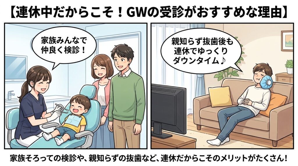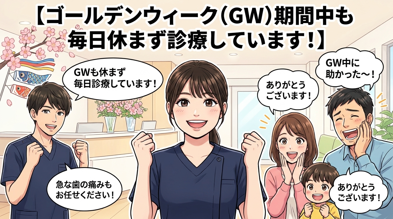 せっかくのゴールデンウィーク。お口のトラブルを我慢することなく、ご家族で楽しく笑顔で過ごしていただきたいからこそ、当院は連休中も皆様をしっかりサポートさせていただきます。
