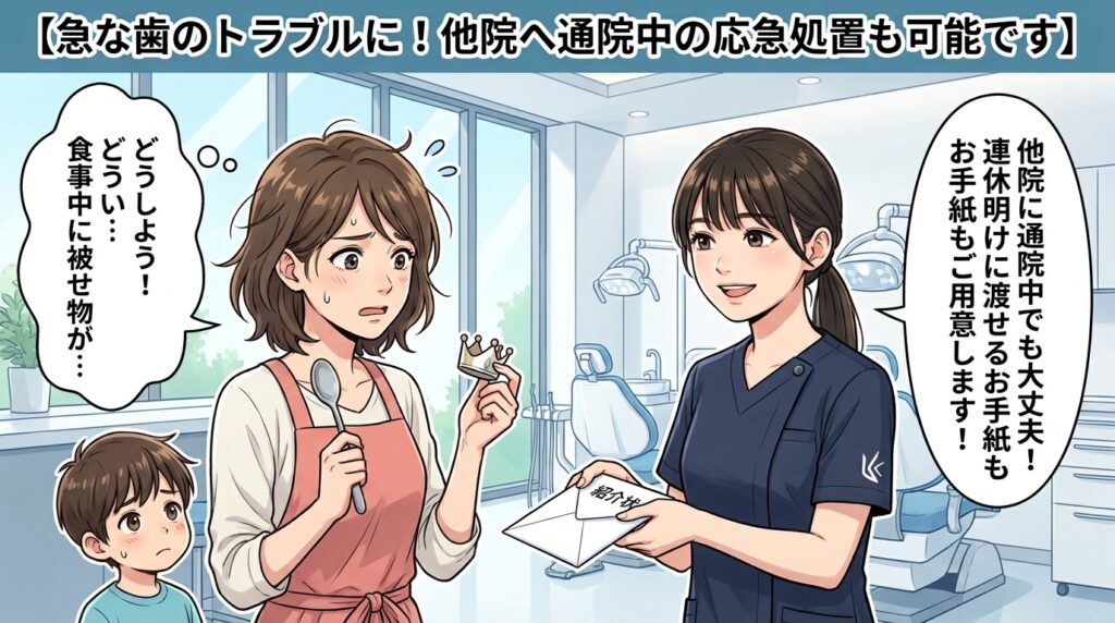 このお手紙をお持ちいただくことで、連休明けにいつもの歯医者さんへ戻られた際も、スムーズに治療を継続していただくことができます。「かかりつけの先生に気まずい思いをすることなく、安心して応急処置をお願いできた」と、たくさんの方に安心いただいております。