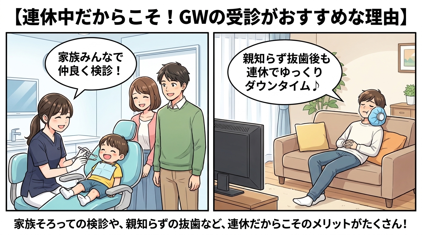 「抜歯の後に顔が腫れたり、痛みが出たりしたら仕事に影響するかも…」と、なかなか一歩を踏み出せずにいる方も多いのではないでしょうか。連休中であれば、術後のダウンタイム(回復期間)をお家でゆっくり休んで過ごすことができるため、非常に安心です。